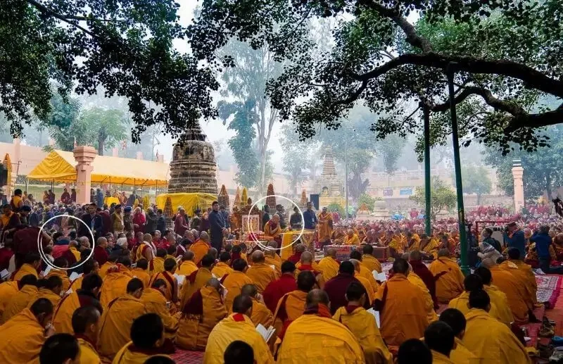 Karin Peeters (in left circle), attending teachings by HH Dalai Lama in Bodhgaya, India