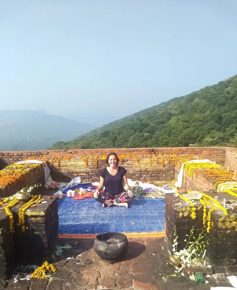 Karin Peeters at Vulture Peak, Rajgir, India. Considered the location where Buddha taught the Heart Sutra.