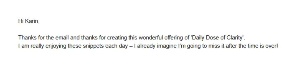 “You convey the essence so beautifully and concisely, with short, helpful exercises. Perfect for me! I love Daily Dose of Clarity, it brings me great new insights.” - Sandra P