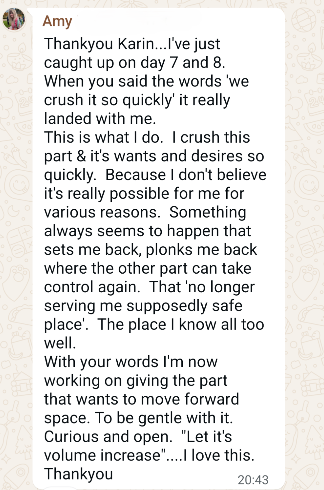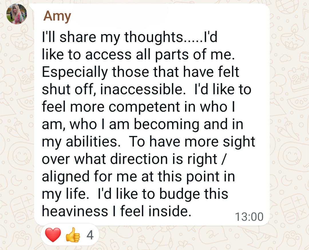 When you invited us to find an image for that stuck part of me, something shifted. I was painting a gift for my husband with calm, rippling water in the background and that was what came up. Instead of the big exciting waves I thought I needed, suddenly I knew: these small quiet waves have their own beauty... My time for big movements will come again. But for now, I should appreciate this phase for what it is. That realisation brought relief, perspective, and a surprising sense of peace. Thank you.”